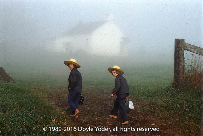 Charm, Holmes Co. Ohio Bright red tree along road in fog three girls riding in cart going away to school