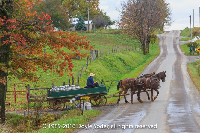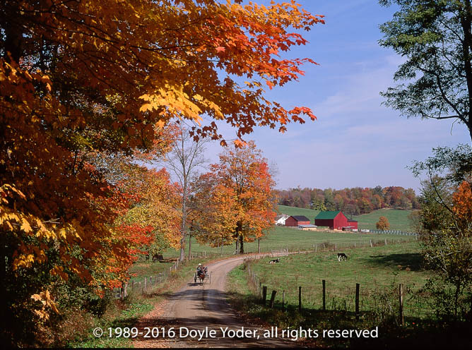 Becks Mills, Holmes Co. Ohio Buggy coming up road with bright colored trees and white barn behind