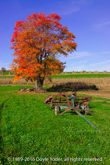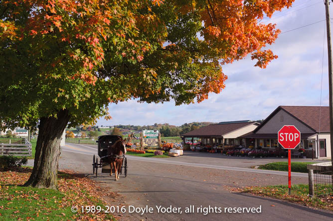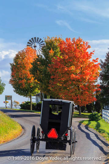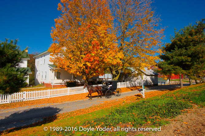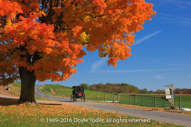 Farmerstown, Holmes Co. Ohio Bright red tree along road with buggy coming down road