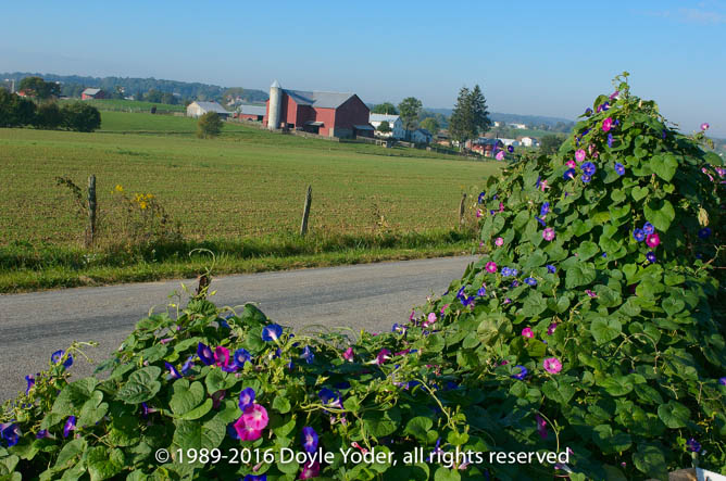 Charm, Holmes Co. Ohio Red barn with morning glories on side with road cart going away on road