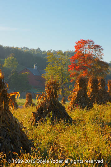 New Bedford, Holmes Co. Ohio Cornshocks in field with colorful trees behind