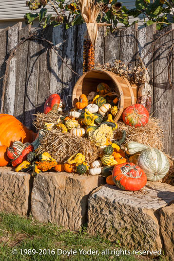 Charm, Holmes Co. Ohio Cornshock and pumpkins in flower garden
