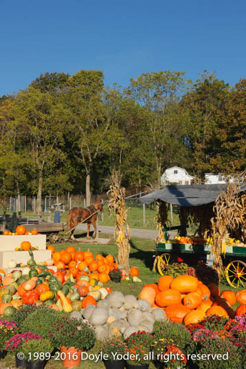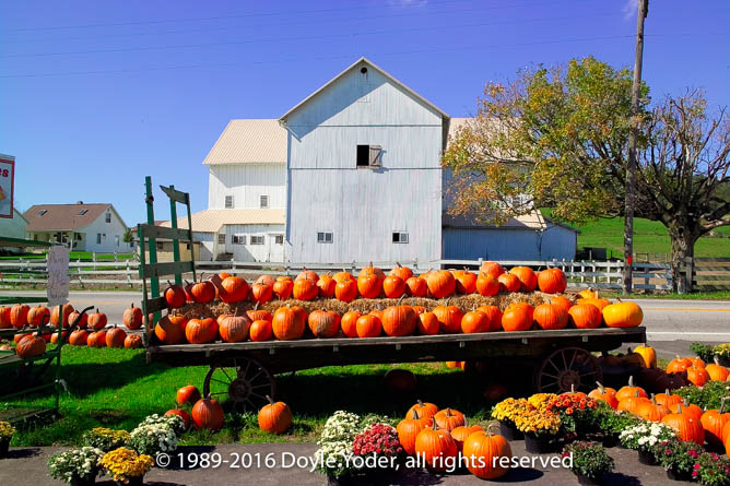 Berlin, Holmes Co. Ohio Pumpkins at Hershberger Truck Patch with white barn behind