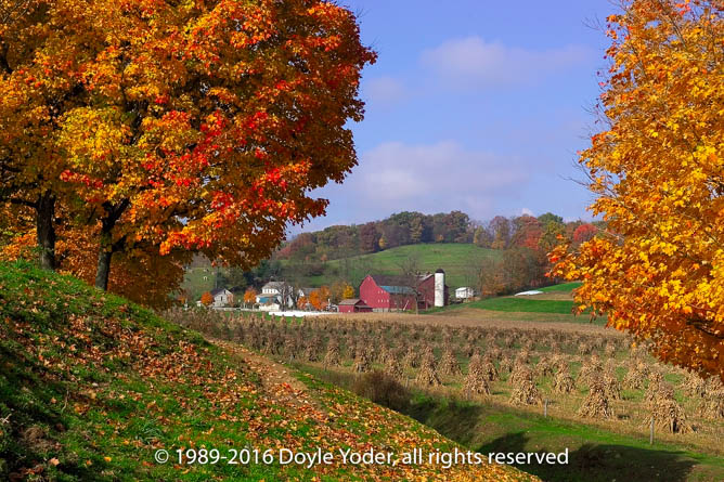 Farmerstown, Holmes Co. Ohio Bright red tree with farm red barn in valley behind Hack going by on road