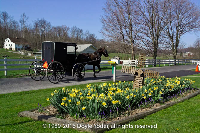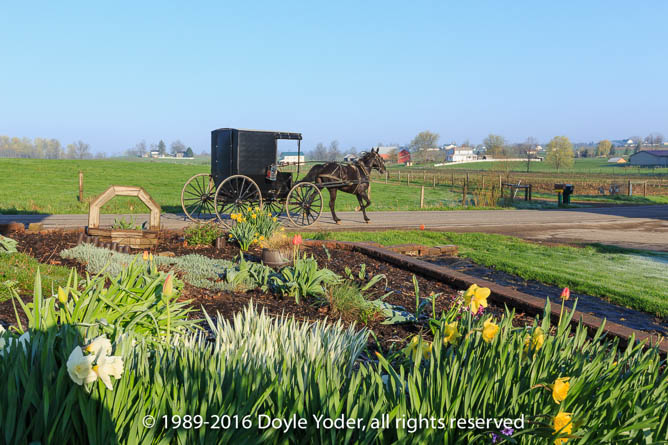 Millersburg, Holmes Co. Ohio Daffodils in flower garden with buggy going past on road