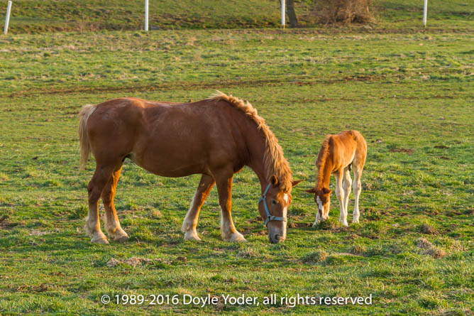 Charm, Holmes Co. Ohio Belgian colt in field with mother