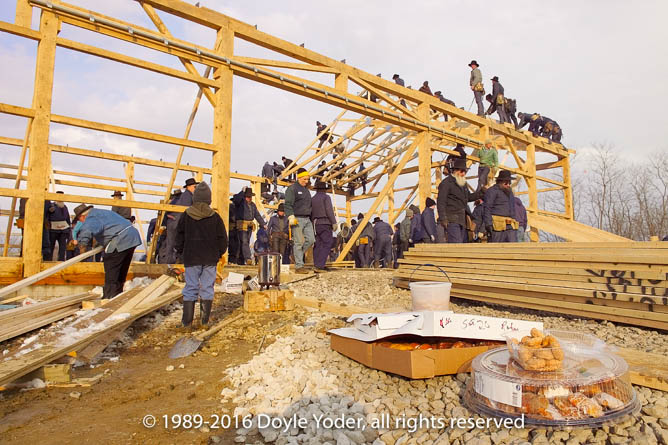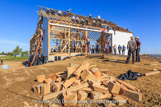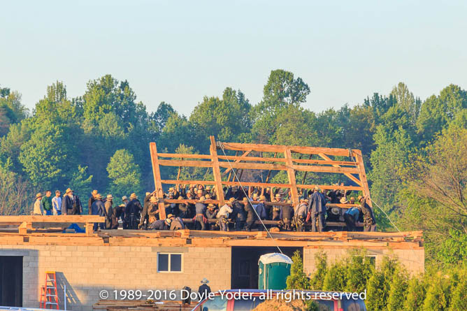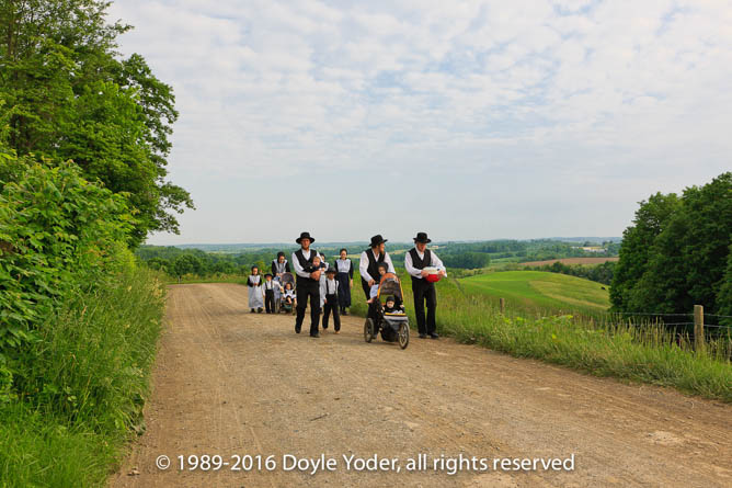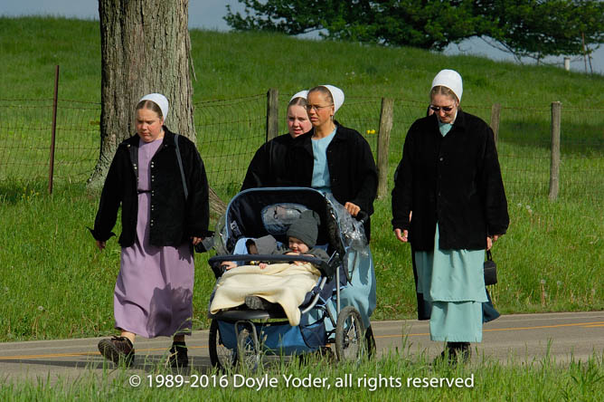 Shreve, Holmes Co. Ohio Buggy going away on road and people walking past flowers and lilac bush towards farm house to church