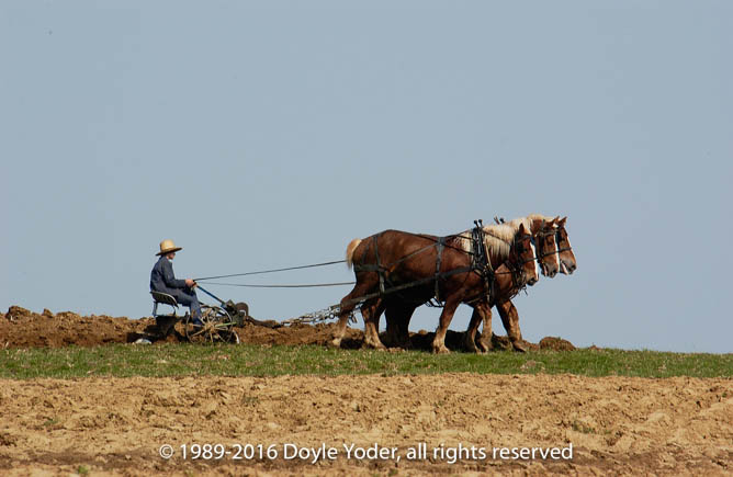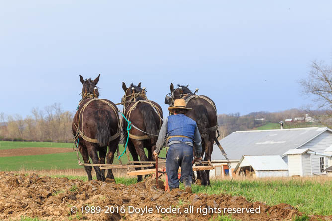 Beck Mills, Holmes Co. Ohio Team of three Percheron horse pulling walking plow plowing field