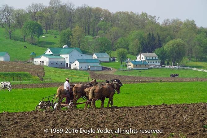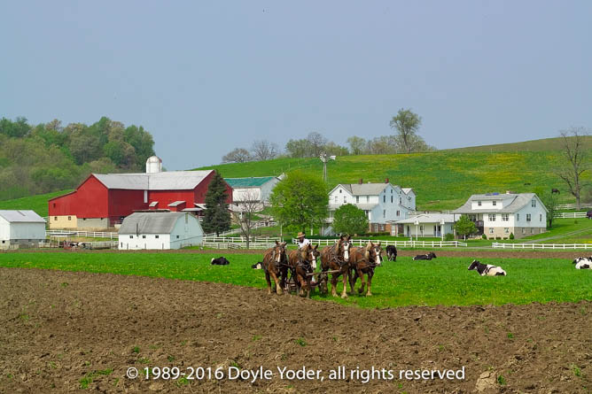 Walnut Creek, Holmes Co. Ohio Team of four Belgian and team of four Perchron horses pulling riding plow in fields with cows in field farm houses and white barn behind