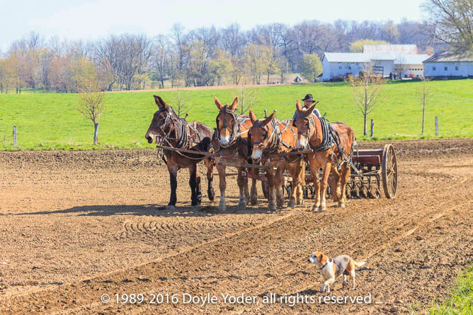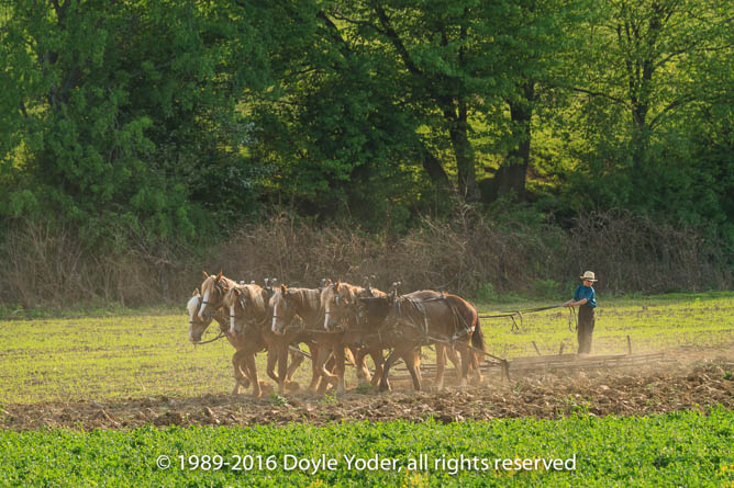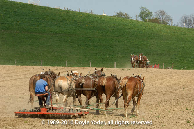 Mt Hope, Holmes Co. Ohio Team of five horses pulling spring harrow and team of two horses pulling corn planter in field behind wagon