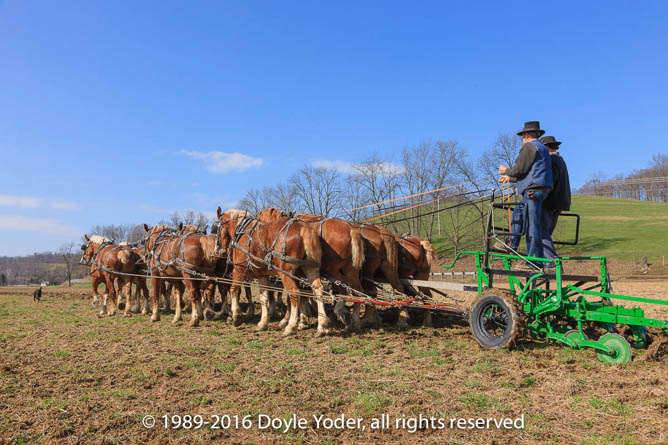 Mt Hope, Holmes Co. Ohio Team of six Belgian horses pulling riding plow in field