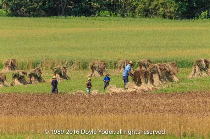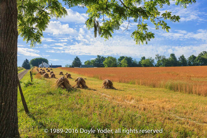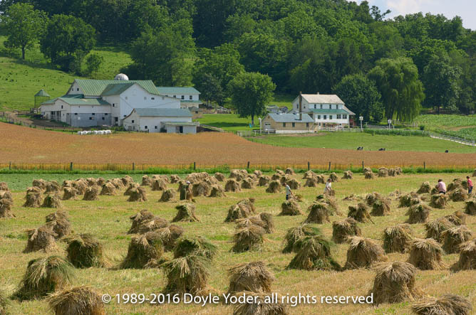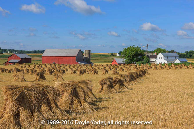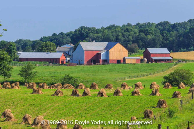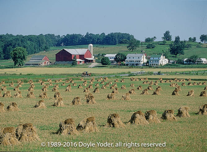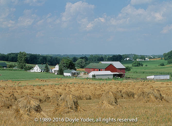 Kidron, Wayne Co. Ohio Oat shocks in front of farm house and red barn