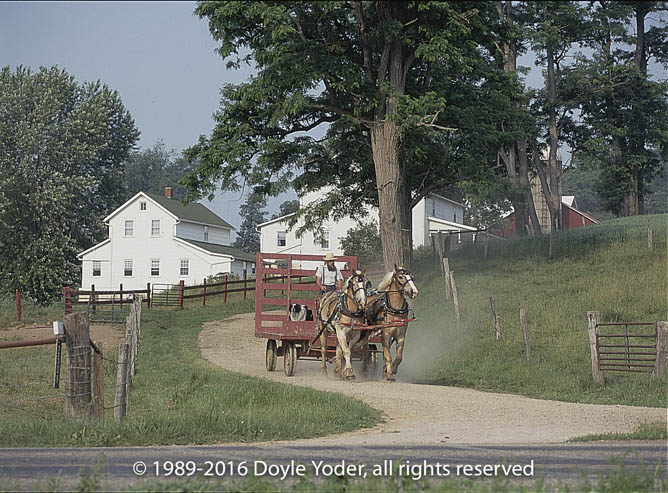Becks Mills, Holmes Co. Ohio Boys and dad on wagon going away on road with sunset behind