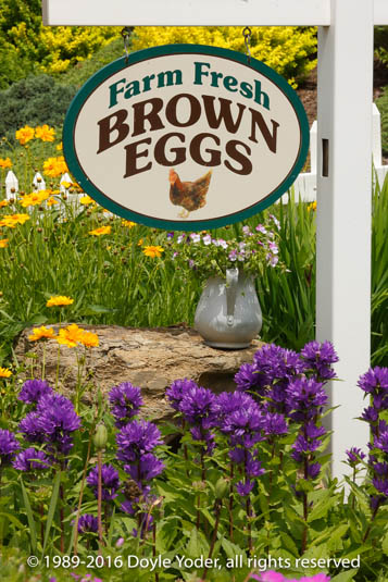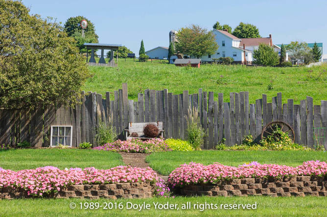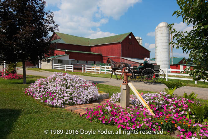 Charm, Holmes Co. Ohio Flower garden with farm house behind buggy going past on road