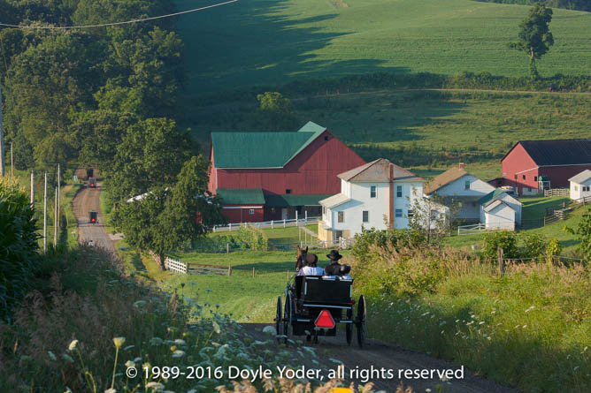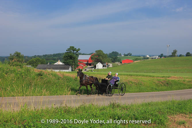 Winesburg, Holmes Co. Ohio Buggy passing on road with view across hills behind