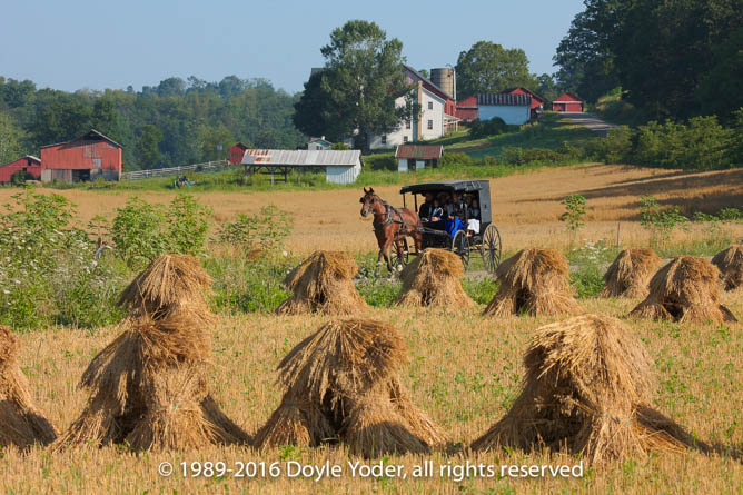big white barn behind field full of wheat shocks, hack with milk cans on going away up lane