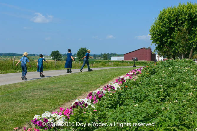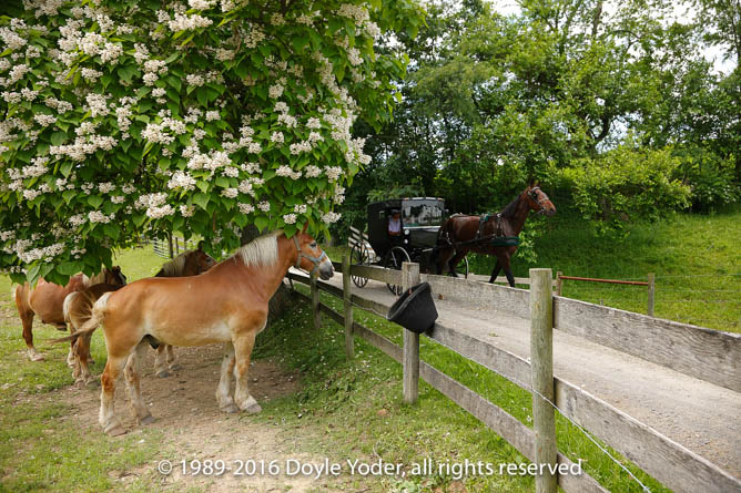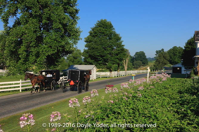 Mt Hope, Holmes Co. Ohio Buggy Flower garden with team of horses pulling wagon behind on road