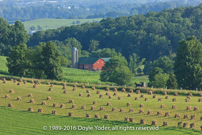 fields of wheat shocks with white barn and farm house in valley below covered hack going on road