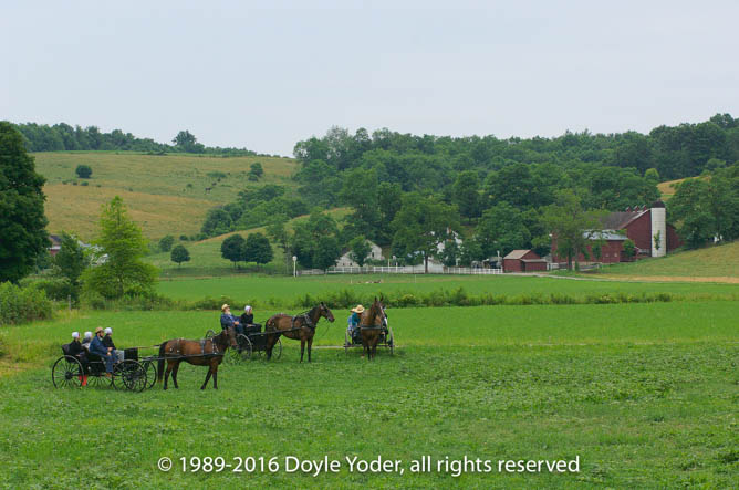 Becks Mills, Holmes Co. Ohio Haflinger horses pulling carriages coming down hill through field