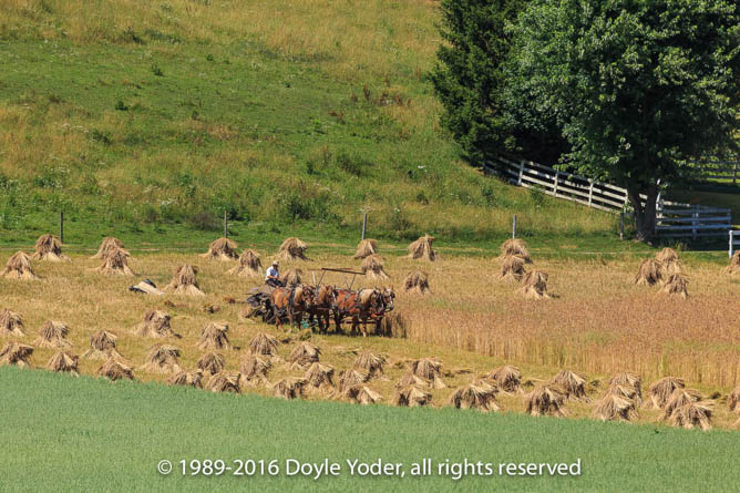Mt Hope, Holmes Co. Ohio team of three belgian horses pulling grain binder in field